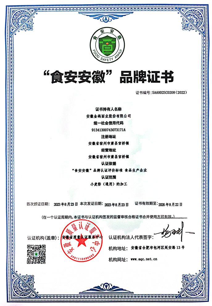 2023年8月23日,安徽金鴿面業(yè)股份有限公司獲得由安徽省質(zhì)量認(rèn)證服務(wù)中心頒發(fā)的“食安安徽”品牌認(rèn)證證書,獲此殊榮,與安徽金鴿面業(yè)股份有限公司近年來(lái)的不懈努力息息相關(guān),同時(shí)也離不開(kāi)全體職工的辛勤付出,公司領(lǐng)導(dǎo)感謝全體職工對(duì)公司做出的貢獻(xiàn),沒(méi)有全體職工的付出,就沒(méi)有金鴿面業(yè)的今天。